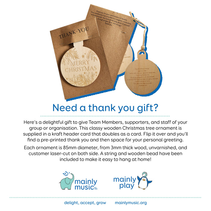 Looking for a delightful gift to give volunteers, supporters, and staff of your group or organisation? This wooden Christmas tree ornament is supplied in a kraft header card that doubles as a card. Flip it over and you’ll find a pre-printed thank you and then space for your personal greeting.