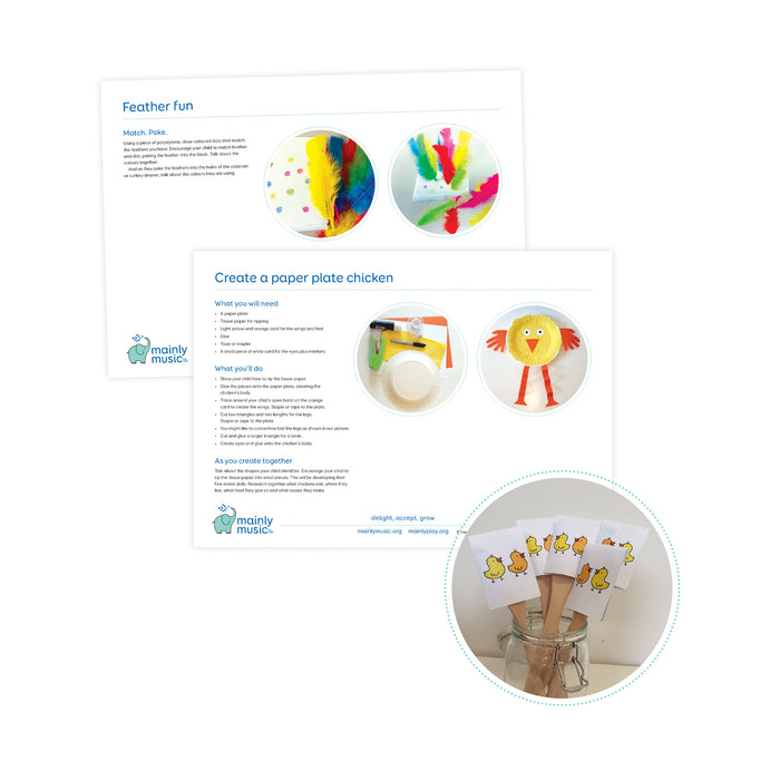 Each pack contains a song that you can play on your phone or device, along with activity sheets to print. The words to the song will be included along with ways to use the song for the best enjoyment and educational outcome for your child. From this range, you'll get a selection of activities to do with your preschool child. (1) Props to add enjoyment to the song. (2) A place mat – make meal or snack times fun with an activity. (3) A sensory activity – using items you’ll have around your home. (4) A craft – created with components available mostly from your grocery store. (5) A literacy and colouring sheet.