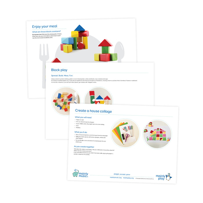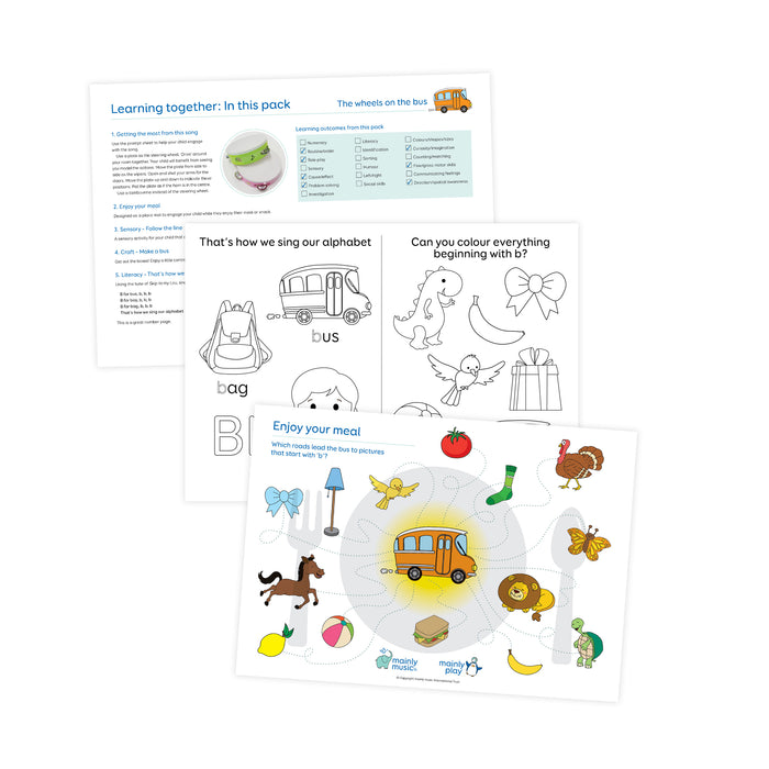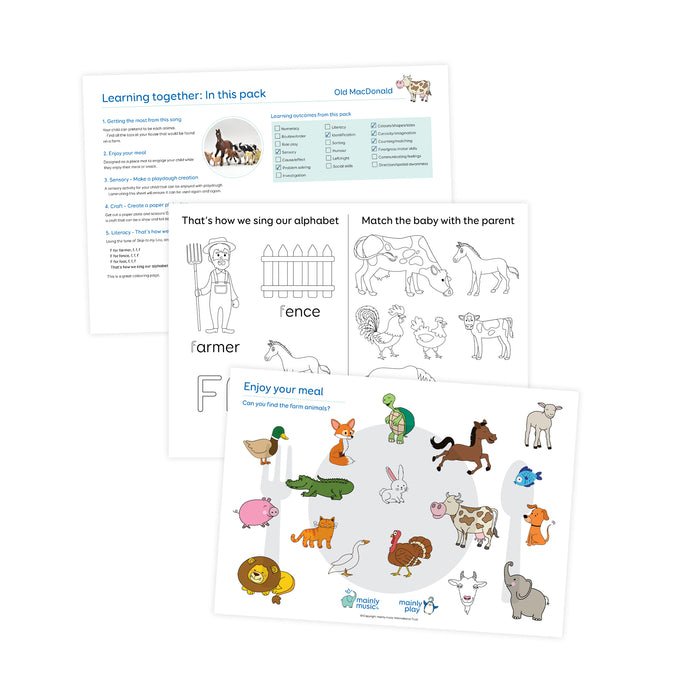 Each pack contains a song that you can play on your phone or device, along with activity sheets to print. The words to the song will be included along with ways to use the song for the best enjoyment and educational outcome for your child. From this range, you'll get a selection of activities to do with your preschool child. (1) Props to add enjoyment to the song. (2) A place mat – make meal or snack times fun with an activity. (3) A sensory activity – using items you’ll have around your home. (4) A craft – created with components available mostly from your grocery store. (5) A literacy and coloring sheet.
